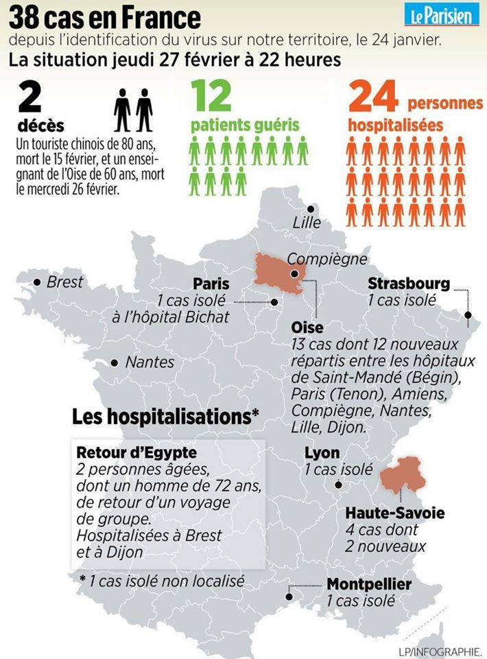 1. ช่วงวันที่ 27-28 ก.พ. 2563 ตรวจพบผู้ติดเชื้อเพิ่มจำนวน 23 ราย ทำให้ขณะนี้ฝรั่งเศสมีผู้ติดเชื้อสะสมรวม 41 ราย เสียชีวิตจำนวน 2 ราย หายดีแล้วจำนวน 12 ราย และอยู่ระหว่างการรักษาจำนวน 27 ราย ทั้งนี้จำนวนยอดผู้ป่วยติดเชื้อมีแนวโน้มที่จะเพิ่มมากขึ้นเนื่องจากยังไม่สามารถตรวจสอบเส้นทางการเดินทางและการติดต่อของผู้ป่วยที่เสียชีวิตไปแล้วได้ทั้งหมด โดยขณะนี้มีผู้ถูกกักตัวเพื่อสังเกตอาการเนื่องจากมีประวัติเคยสัมผัสกับผู้ป่วยที่เสียชีวิตจำนวนหนึ่งซึ่งรวมถึงบุคลากรทางการแพทย์
