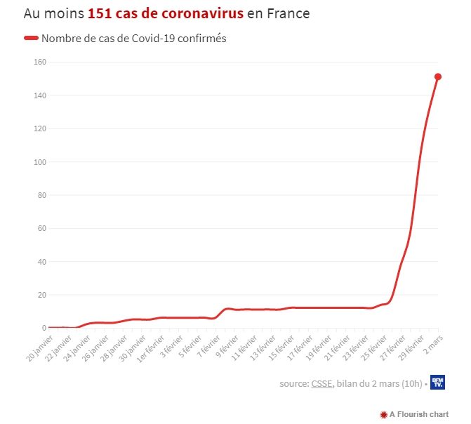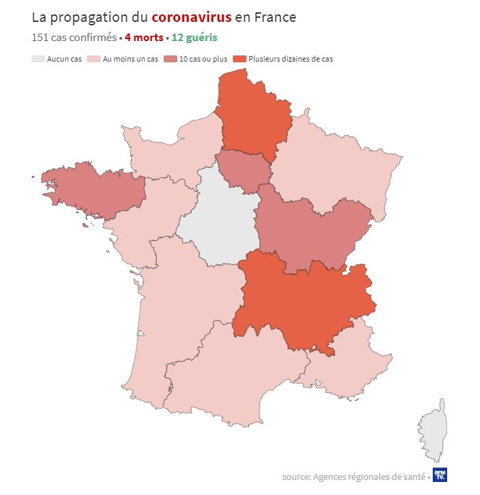1. ฝรั่งเศสมีผู้ป่วยติดเชื้อไวรัส covid-19 สะสมจำนวน 151 ราย โดยมีผู้เสียชีวิต 3 ราย รักษาหายแล้ว 12 ราย และที่เหลือยังอยู่ใน รพ. ทั้งนี้ พบผู้ติดเชื้อใน 12 แคว้น จากทั้งหมด 18 แคว้น โดยแคว้น Ile-de-France, Auvergne-Rhône-Alpes และ les Hauts-de-France พบผู้ป่วยติดเชื้อมากกว่า 10 ราย และมีพื้นที่ที่มีการแพร่ระบาดของเชื้อไวรัสมากกว่าที่อื่น ๆ ในฝรั่งเศสจำนวน 3 พื้นที่ ได้แก่ จังหวัด Oise, Haute-Savoie และ Morbihan (ซึ่งมีผู้ป่วยติดเชื้อรวม 72 รายในพื้นที่ดังกล่าว) เป็นผลให้ฝรั่งเศสเป็นพื้นที่ที่มีการแพร่ระบาดของไวรัสเป็นลำดับที่สองในยุโรป รองจากอิตาลี