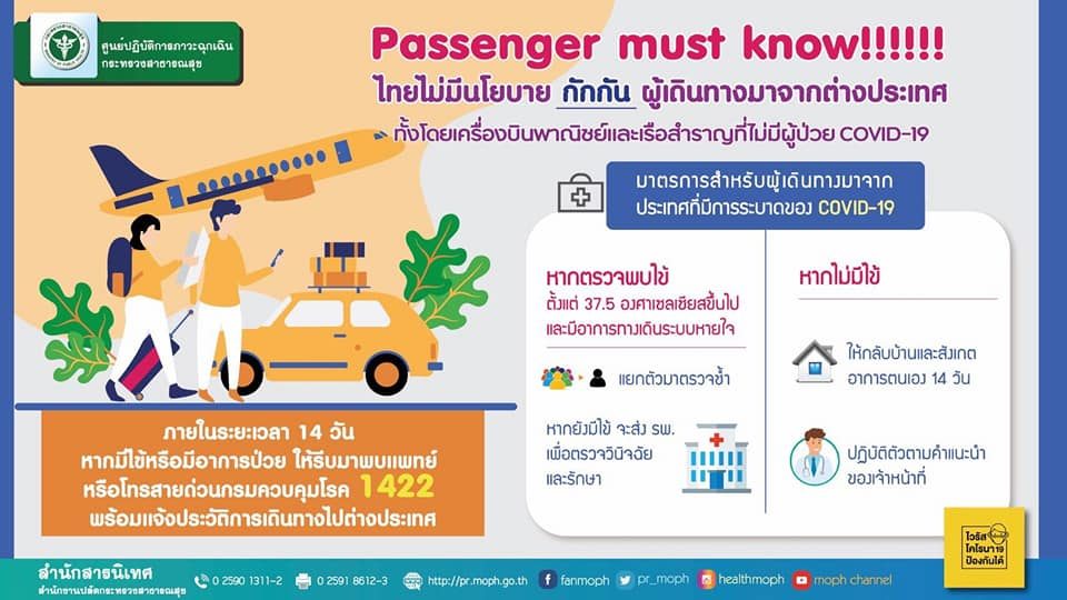 4.2 กลุ่มไม่สัมผัสกับผู้ป่วย ไม่มีอาการ แต่มีความเสี่ยงเนื่องจากเดินทางจากพื้นที่ระบาด (ทั้งคนไทยและชาวต่างชาติ) ขอให้ลดกิจกรรมทางสังคม สวมหน้ากากอนามัยเมื่อออกจากที่พัก หมั่นล้างมือ อย่าไปในพื้นที่ที่มีคนอยู่หนาแน่น ให้สังเกตอาการตัวเองที่บ้านเป็นเวลา 14 วัน หากมีไข้ ไอ เจ็บคอ พบแพทย์ทันทีพร้อมแจ้งประวัติเดินทาง