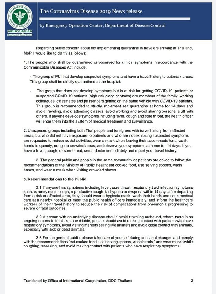 4.ในส่วนของไทย เมื่อวันที่ 3 มี.ค.2563 กระทรวงสาธารณสุขได้แจ้งข้อแนะนำเกี่ยวกับการปฏิบัติตัวของประชาชน รวมถึงผู้ที่เดินทางมาจากพื้นที่ระบาด (ทั้งคนไทยและชาวต่างชาติ) ดังนี้