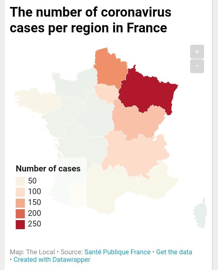 1.วันที่ 10 มี.ค. 2563 (สถานะเวลา 15.00 น.) ฝรั่งเศสมียอดผู้ป่วยติดเชื้อไวรัส covid-19 สะสม จำนวน 1,784 ราย (เพิ่มขึ้น 372 ราย) มีอาการหนัก 86 ราย และมีผู้เสียชีวิต จำนวน 33 ราย (เพิ่มขึ้น 8 ราย เป็นผู้ชาย 19 ราย ผู้หญิง 14 ราย โดยผู้เสียชีวิต 23 รายมีอายุมากกว่า 75 ปี หรือมีโรคแทรกซ้อน) และยังคงระดับการแพร่ระบาดไวรัสที่ระดับ 2 โดยแคว้นที่มีผู้ป่วยมากที่สุด ได้แก่ Corse, Grand Est, Bourgogne Franche-Comté, les Hauts de France, Île de France, Auvergne Rhône-Alpes