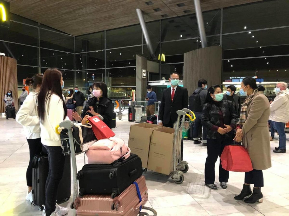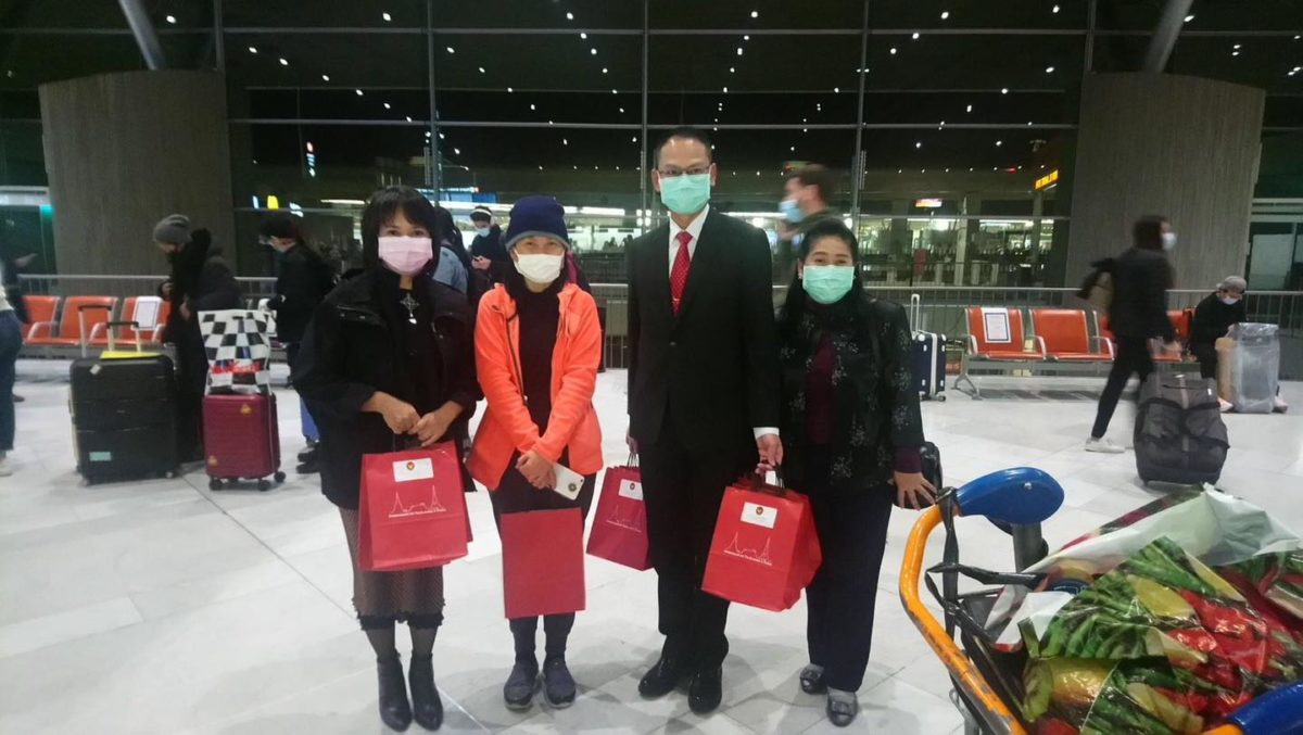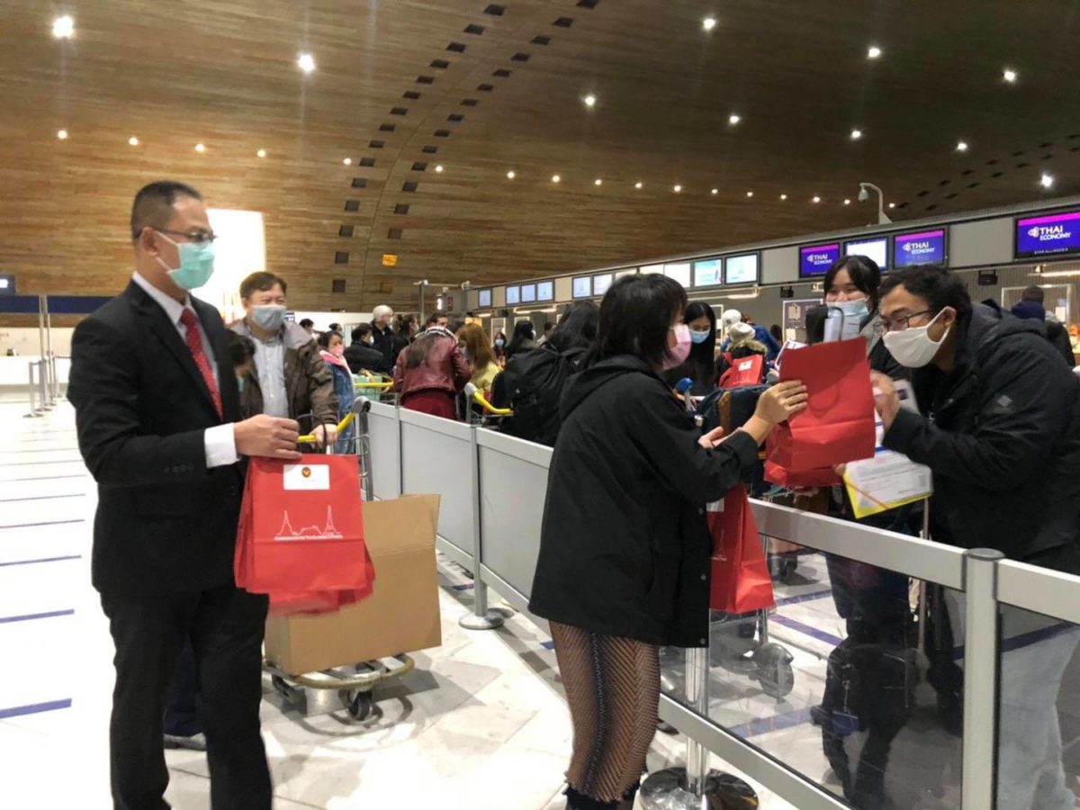 ในการนี้ คณะผู้แทนสถานเอกอัครราชทูตฯ ได้พูดคุยและมอบถุงกำลังใจ พร้อมอาหารและเครื่องอุปโภคแก่ผู้โดยสารทั้งไทยและต่างชาติ รวมทั้งช่วยอำนวยความสะดวกในตรวจเอกสารและประสานงานกับสายการบินไทยด้วย
