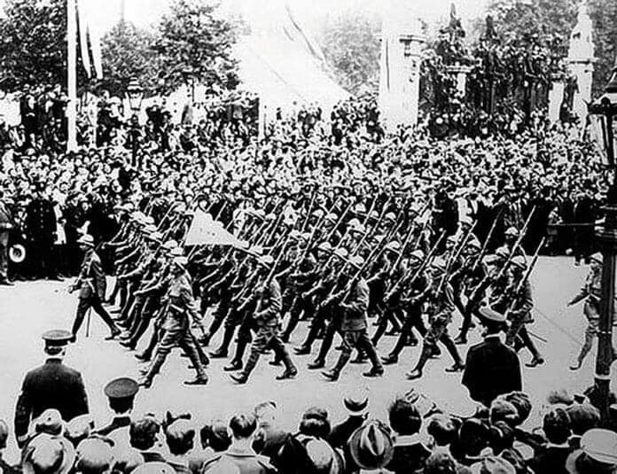 เมื่อวันที่ 22 ก.ค. 2460 (ค.ศ. 1917) ในรัชสมัยพระบาทสมเด็จพระมงกุฎเกล้าเจ้าอยู่หัว รัชกาลที่ 6 พระองค์ได้ทรงประกาศร่วมรบกับฝ่ายสัมพันธมิตร โดยได้ส่งกองทหารอาสาจำนวน 1,284 นาย จากกองทัพบกรถยนต์และกองบินทหารบกไปยังฝรั่งเศส นับเป็น 1 ใน 3 ประเทศในเอเชียที่ประกาศร่วมสงครามกับฝ่ายสัมพันธมิตร