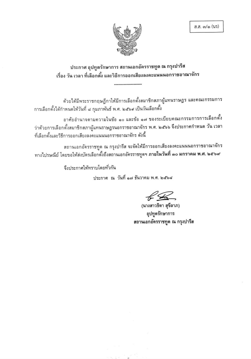 อาศัยอำนาจตามความในข้อ ๑๐ และข้อ ๑๗ ของระเบียบคณะกรรมการการเลือกตั้งว่าด้วยการเลือกตั้งสมาชิกสภาผู้แทนราษฎรนอกราชอาณาจักร พ.ศ. ๒๕๖๖ จึงประกาศกำหนด วัน เวลา ที่เลือกตั้ง และวิธีการออกเสียงลงคะแนนนอกราชอาณาจักร โดยให้ออกเสียงลงคะแนนทางไปรษณีย์และให้ส่งบัตรเลือกตั้งถึง สถานเอกอัครราชทูต ณ กรุงปารีส ภายในวันที่ ๓๐ เดือน มกราคม พ.ศ. ๒๕๖๙