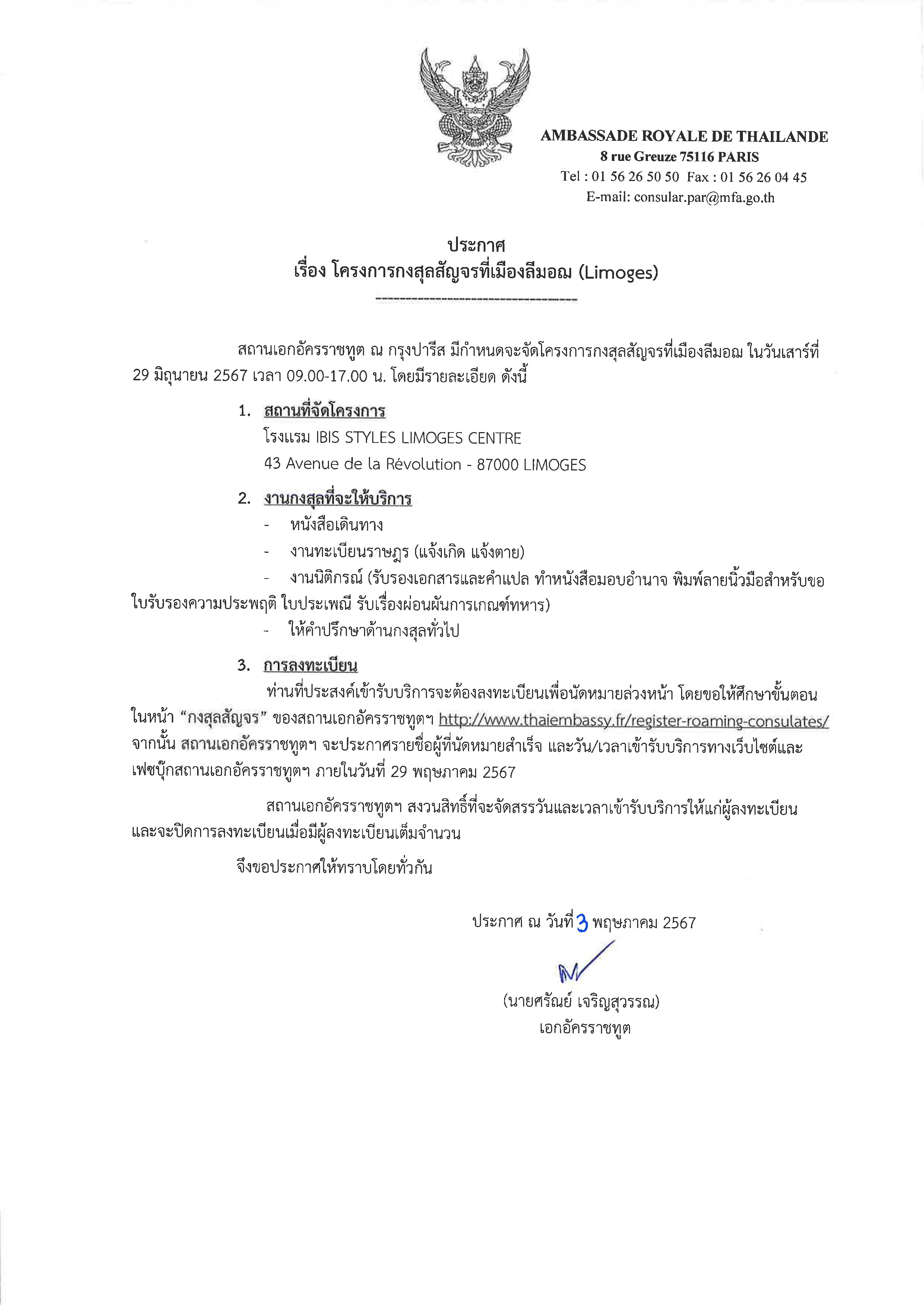 อ่านต่อ สถานเอกอัครราชทูต ณ กรุงปารีส ขอประกาศรายชื่อผู้มีสิทธิสอบข้อเขียนเพื่อคัดเลือกให้ดำรงตำแหน่ง เสมียน (ฝ่ายกงสุล) ดังรายละเอียดปรากฏตามเอกสารแนบ