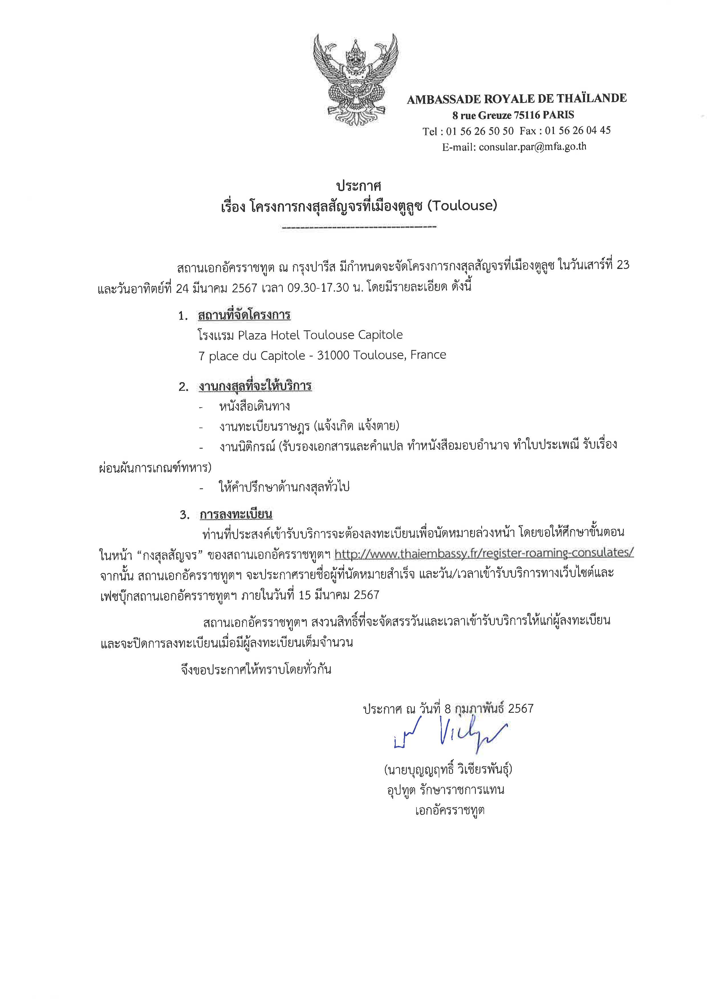 ประกาศ เรื่อง โครงการกงสุลสัญจรที่เมืองตูลูซ (Toulouse)