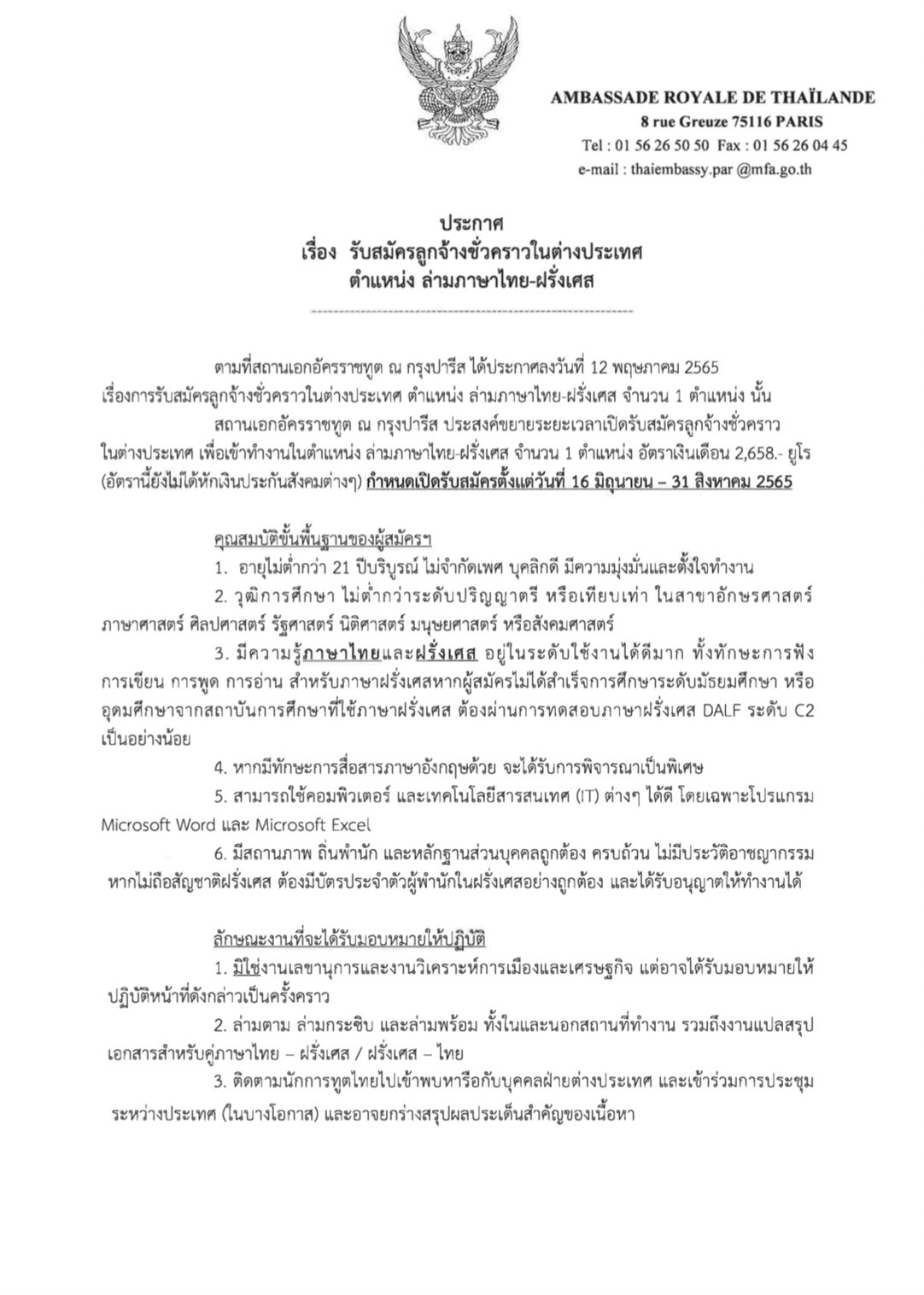 อ่านต่อ ประกาศรายชื่อผู้มีสิทธิเข้ารับการสอบสัมภาษณ์ ลูกจ้างชั่วคราวในต่างประเทศ ตำแหน่ง ผู้ช่วยดำเนินการด้านสารนิเทศและวัฒนธรรม