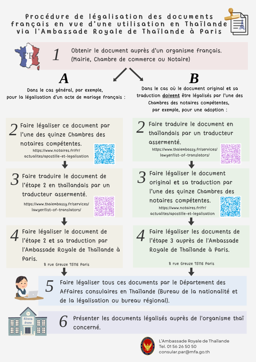 Les documents rédigés en français doivent être préalablement légalisés par la Chambre ou le Conseil des notaires compétent, avant de pouvoir être présentés à l’Ambassade Royale de Thaïlande pour légalisation.