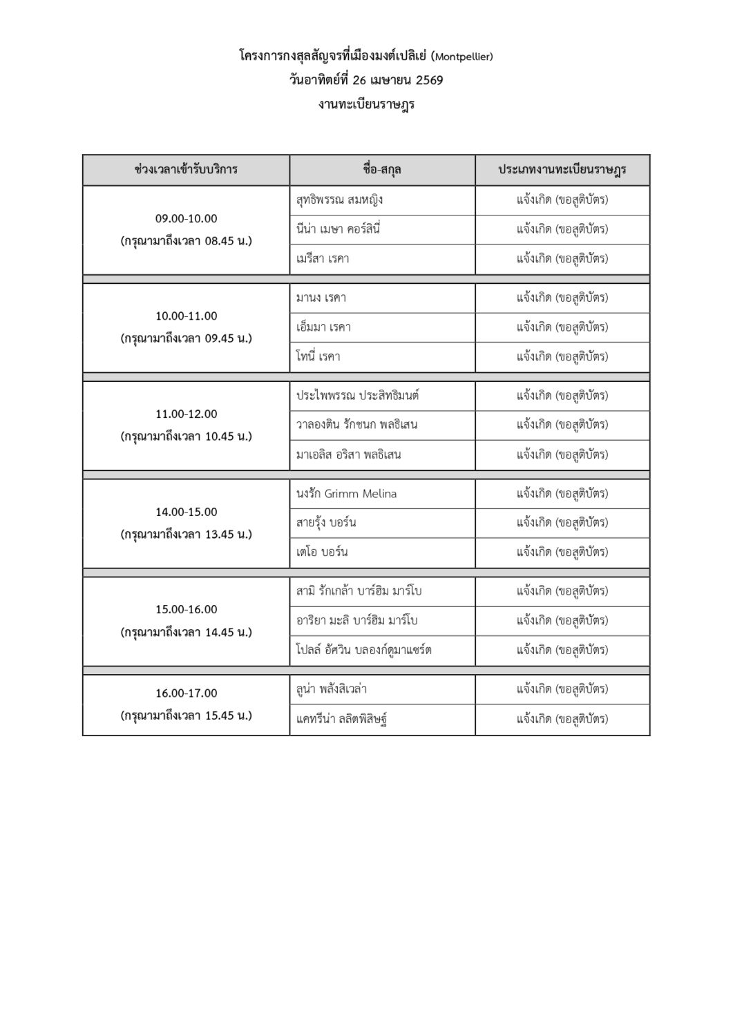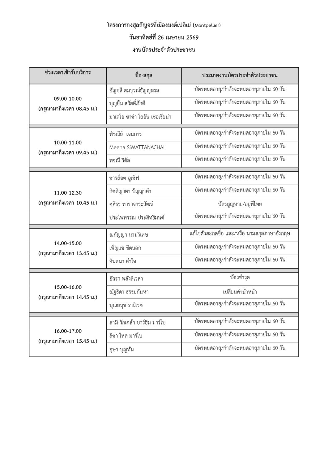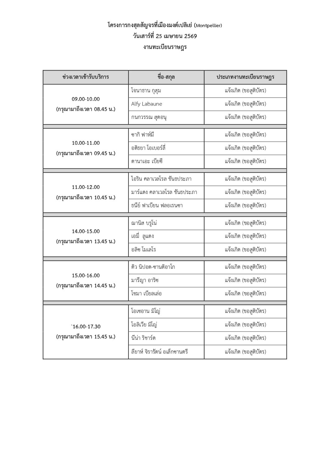สถานเอกอัครราชทูต ณ กรุงปารีส ขอประกาศรายชื่อและคิวนัดหมายของผู้เข้ารับบริการกงสุลสัญจรที่เมืองมงต์เปลิเย่ (Montpellier) วันเสาร์ที่ 25 และวันอาทิตย์ที่ 26 เมษายน 2569