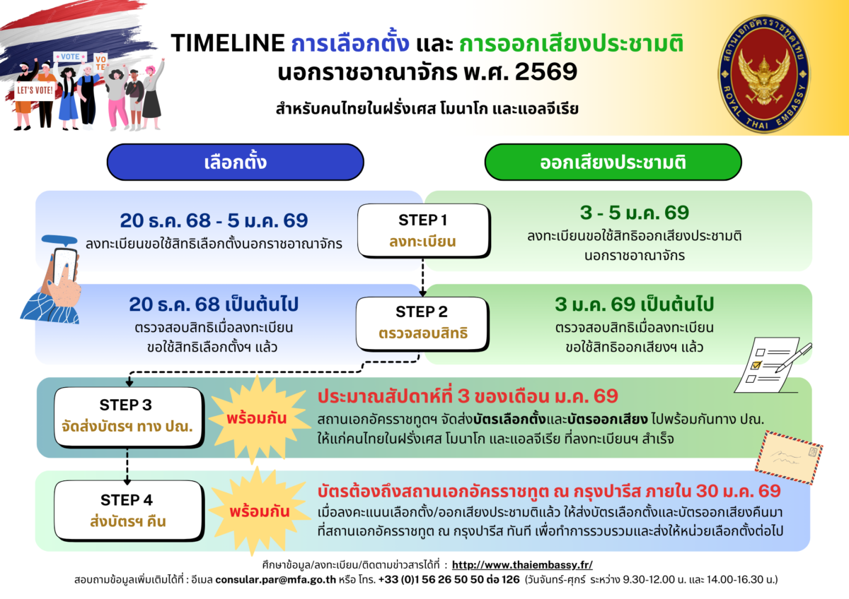 – สถานเอกอัครราชทูตฯ ผ่านทางอีเมล consular.par@mfa.go.th หรือ โทร. +33(0)1 56 26 50 50 ext. 126 (ระหว่างวันและเวลาทำการ)