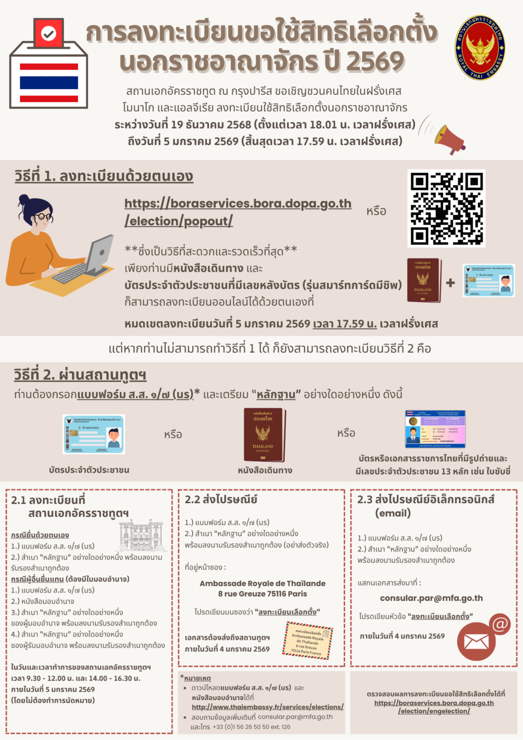 วิธีที่ 1. ด้วยตนเอง ที่ https://boraservices.bora.dopa.go.th/election/popout/ โดยท่านต้องมีหนังสือเดินทางและบัตรประชาชนใบล่าสุดที่มีเลขหลังบัตร (รุ่นสีฟ้ามีชิพ) หมดเขตวันที่ 5 มกราคม 2569 เวลาฝรั่งเศส 19.00 น.