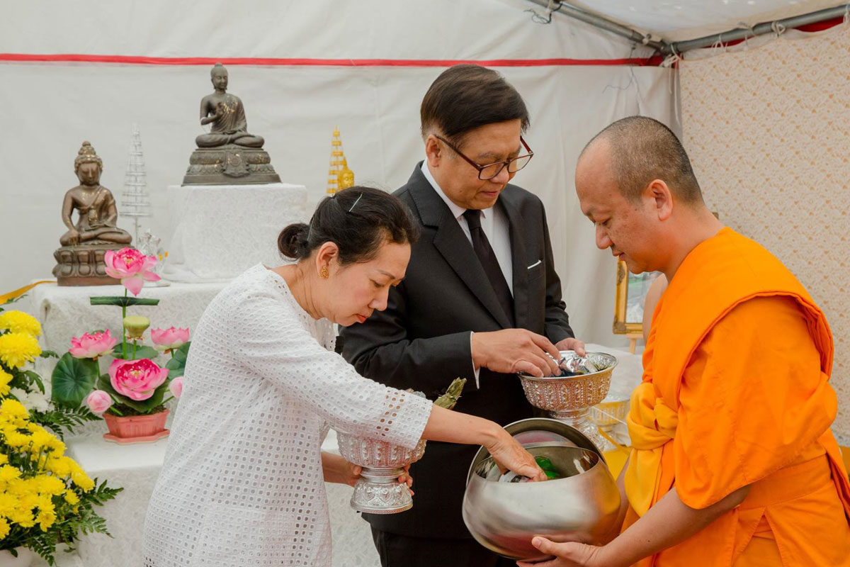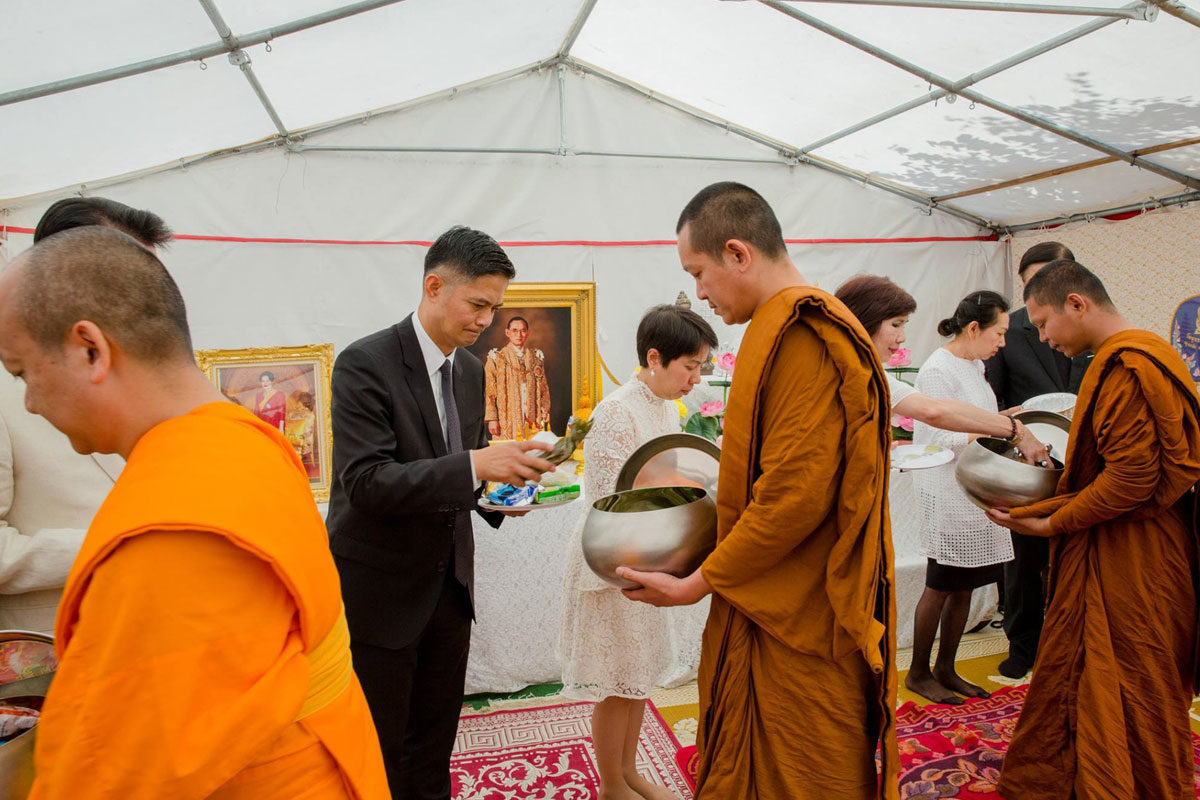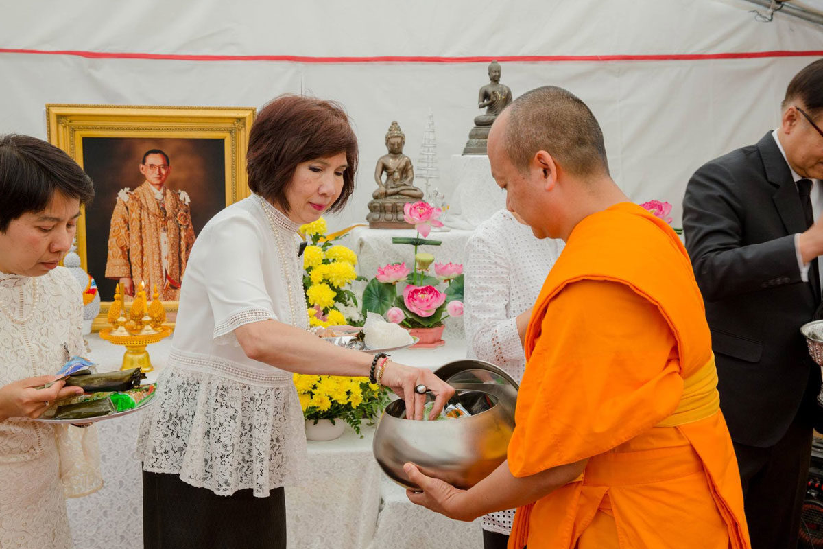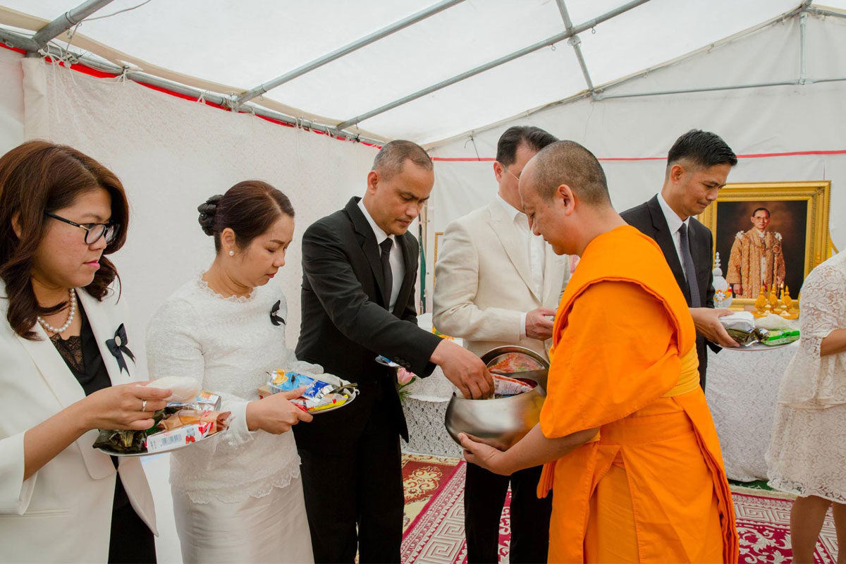 ต่อมาเวลา 11.00 น. เอกอัครราชทูตฯ และภริยา พร้อมด้วยข้าราชการและลูกจ้างสำนักงานทีมประเทศไทยและประชาชน ได้ร่วมพิธีทำบุญตักบาตรถวายเป็นพระราชกุศล ณ วัดพุทธนานาชาติ เมือง Villejuif โดยมีผู้เข้าร่วมจำนวนประมาณ 80 คน