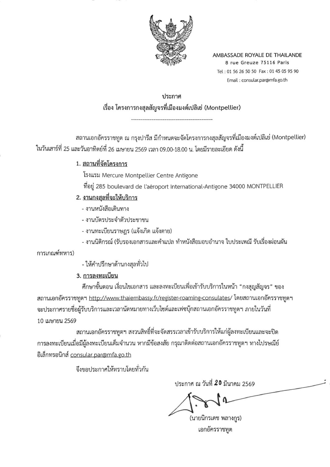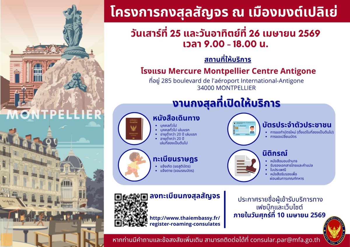 สถานเอกอัครราชทูต ณ กรุงปารีส มีกำหนดจะจัดโครงการกงสุลสัญจร ณ เมืองมงต์เปลิเย่ (Montpellier) ในวันเสาร์ที่ 25 และวันอาทิตย์ที่ 26 เมษายน 2569 ที่โรงแรม Mercure Montpellier Centre Antigone ที่อยู่ 285 boulevard de l’aéroport International-Antigone 34000 Montpellier
