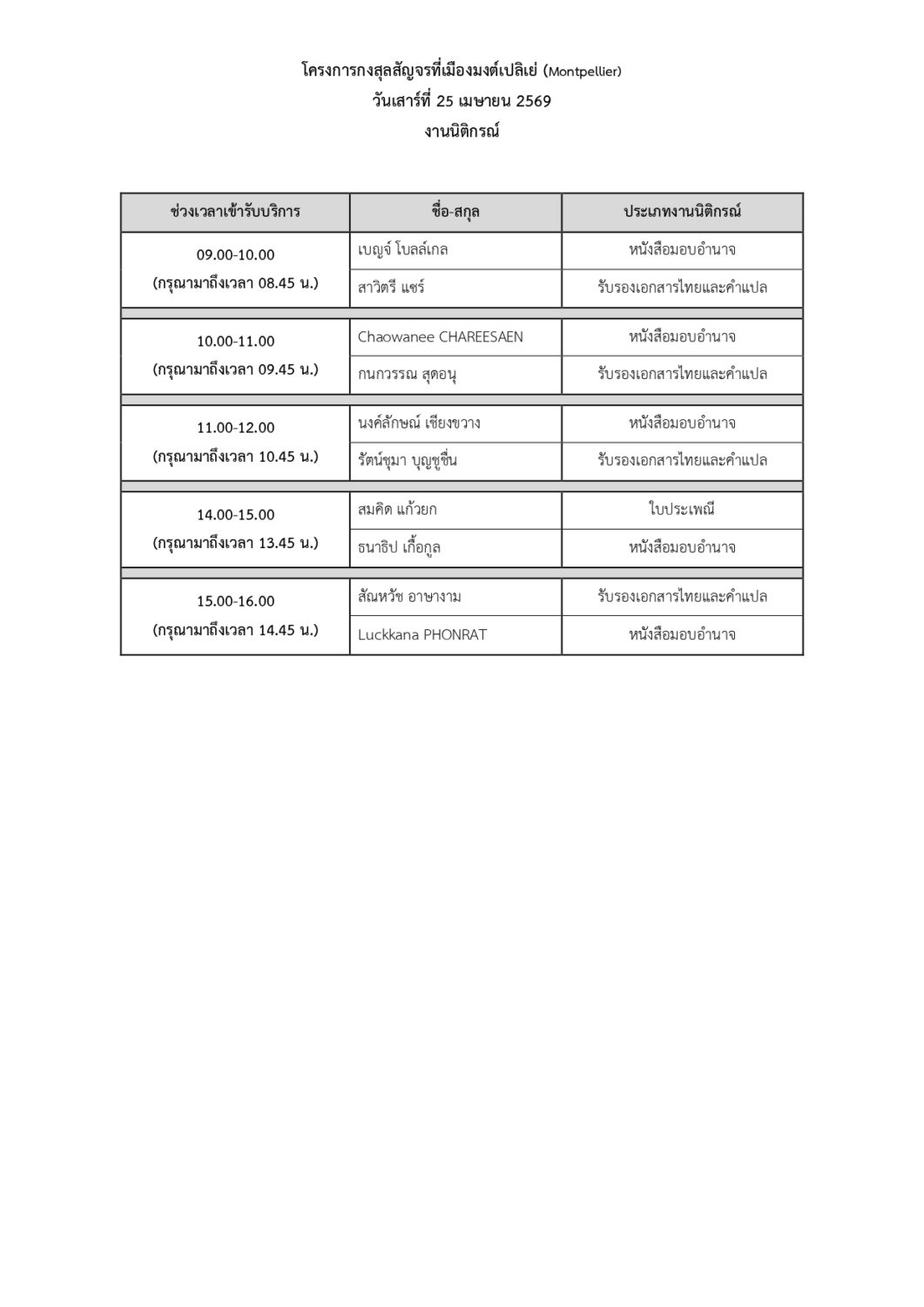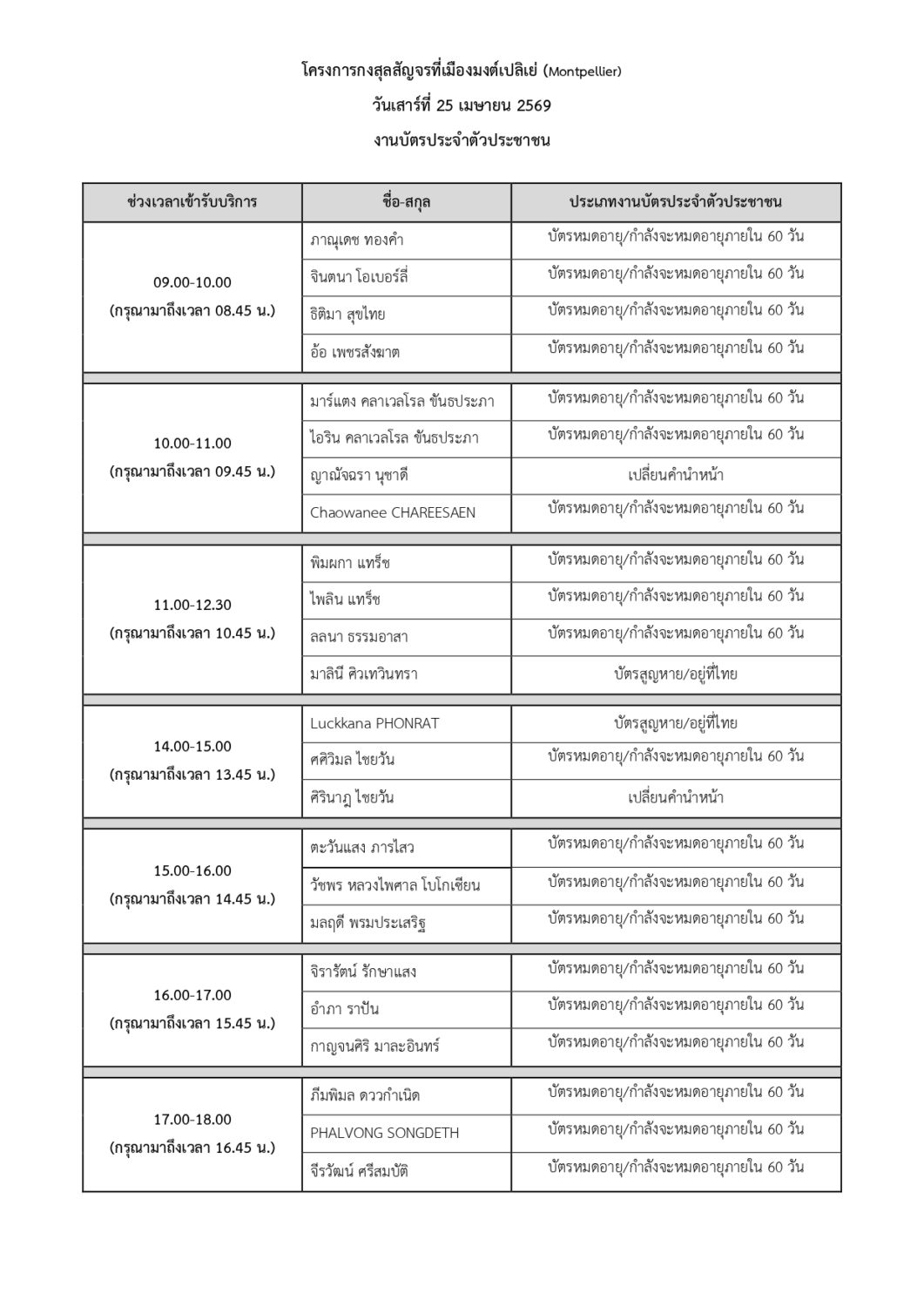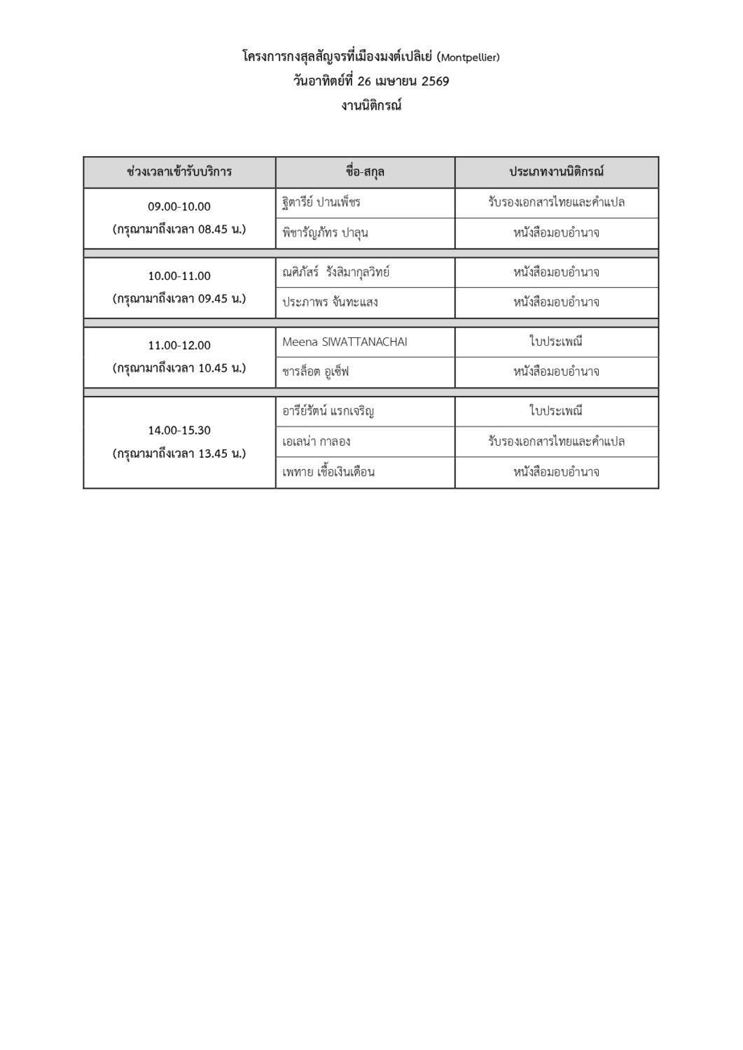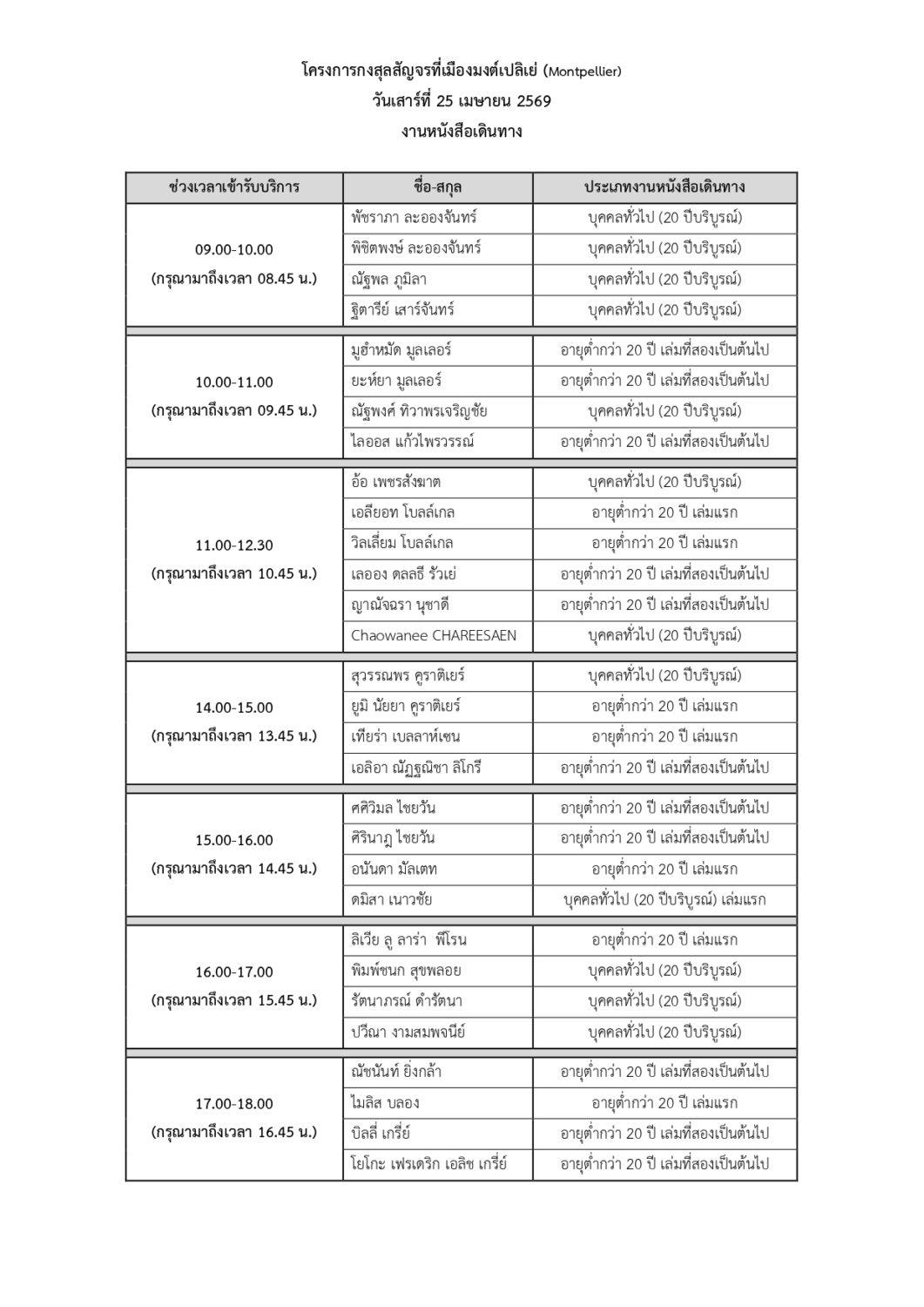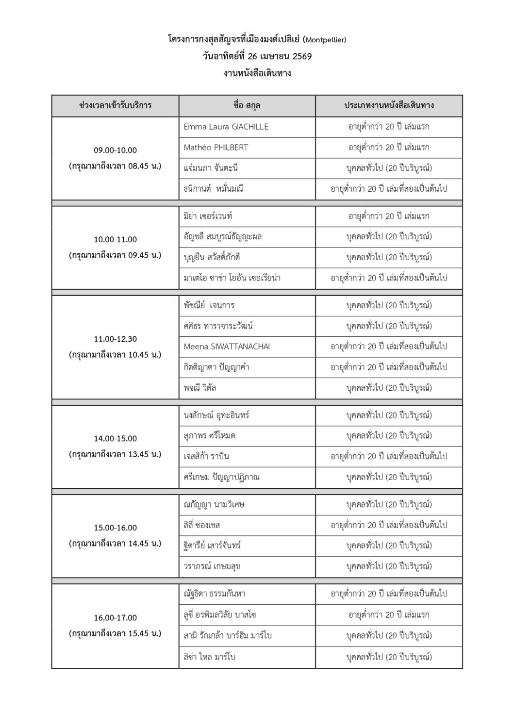 สถานเอกอัครราชทูต ณ กรุงปารีส ขอประกาศรายชื่อและคิวนัดหมายของผู้เข้ารับบริการกงสุลสัญจรที่เมืองมงต์เปลิเย่ (Montpellier) วันเสาร์ที่ 25 และวันอาทิตย์ที่ 26 เมษายน 2569
