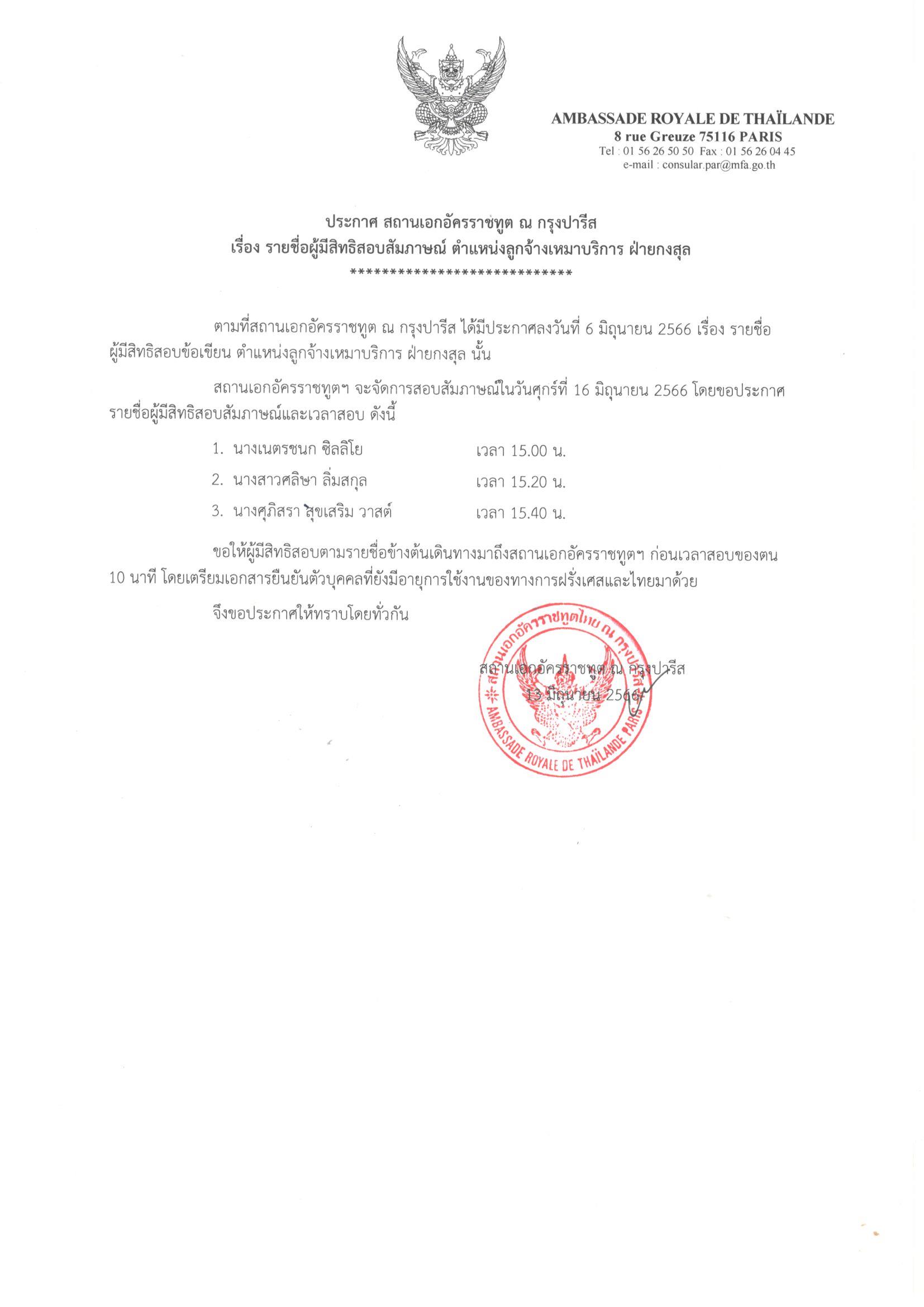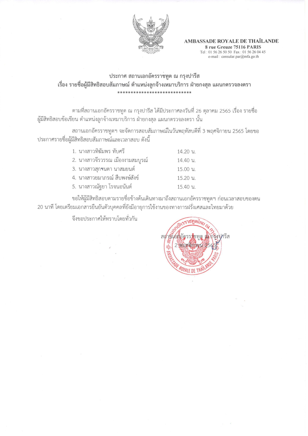 อ่านต่อ ประกาศรายชื่อผู้มีสิทธิเข้ารับการสอบสัมภาษณ์ลูกจ้างชั่วคราวในต่างประเทศ ตำแหน่ง ล่ามภาษาไทย-ฝรั่งเศส