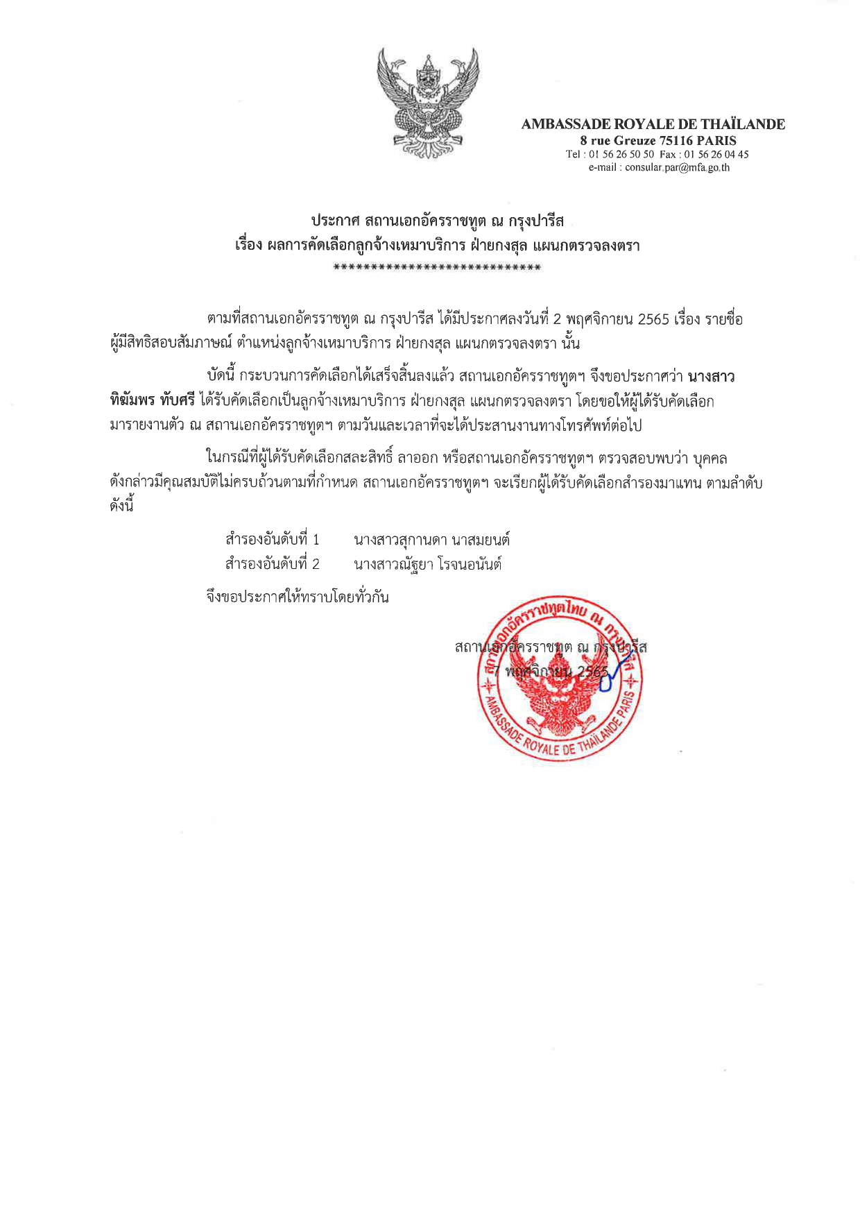 อ่านต่อ ประกาศผลการคัดเลือกลูกจ้างชั่วคราวในต่างประเทศ ตำแหน่ง ล่ามภาษาไทย-ฝรั่งเศส รายละเอียดตามเอกสารแนบ