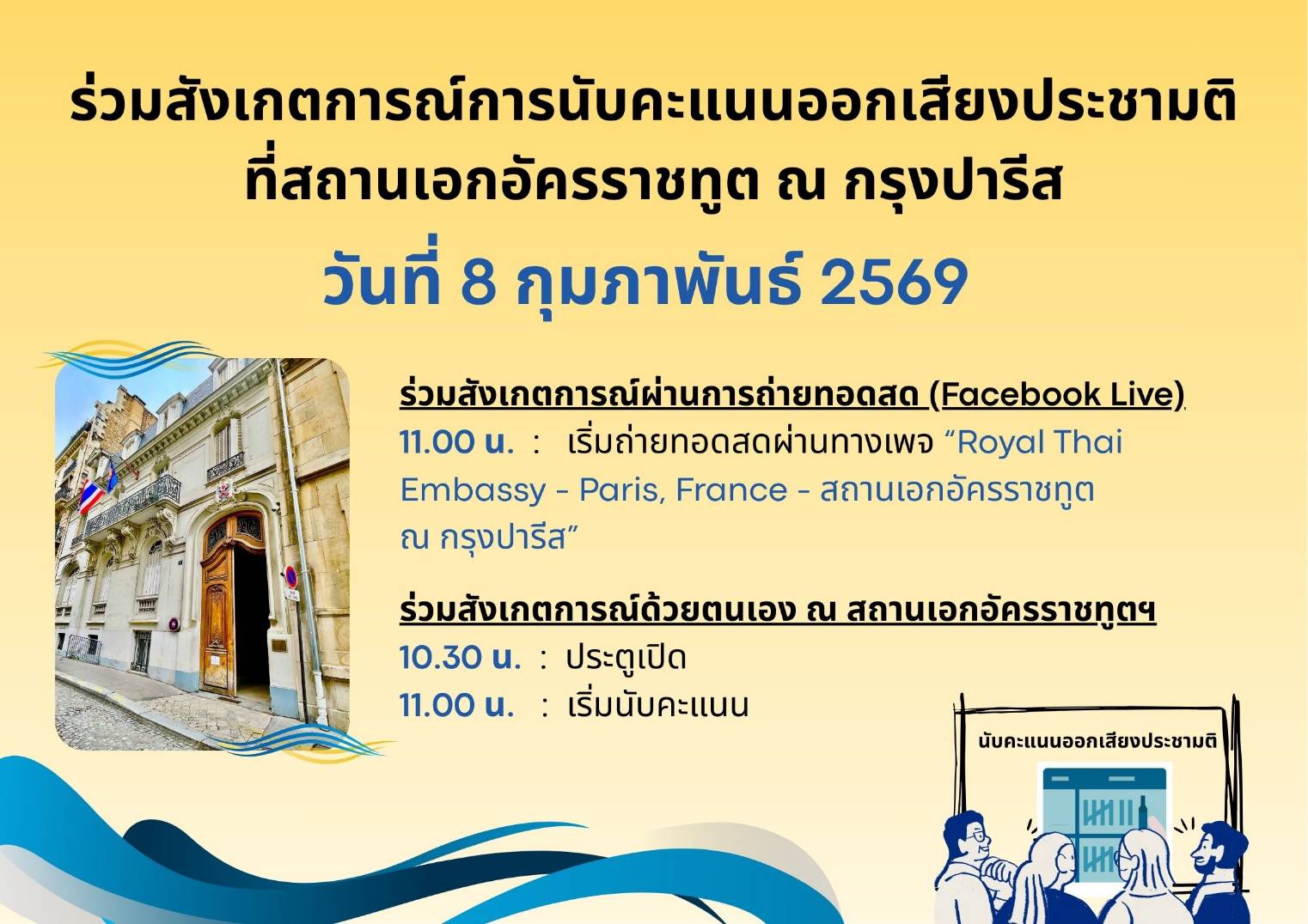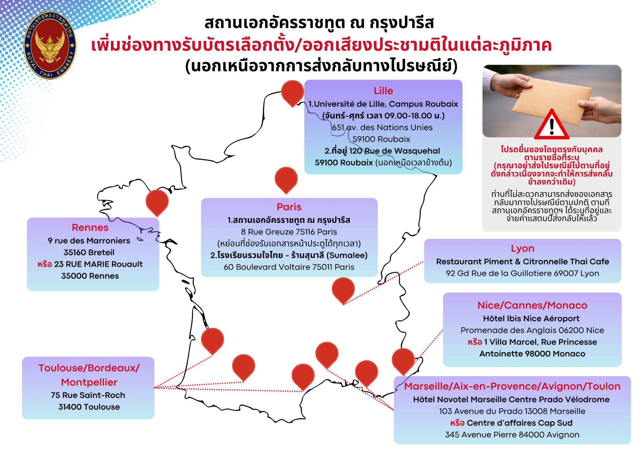 อ่านต่อ สถานเอกอัครราชทูต ณ กรุงปารีสเพิ่มช่องทางในการรับบัตรเลือกตั้ง/บัตรออกเสียงประชามตินอกเหนือจากทางไปรษณีย์