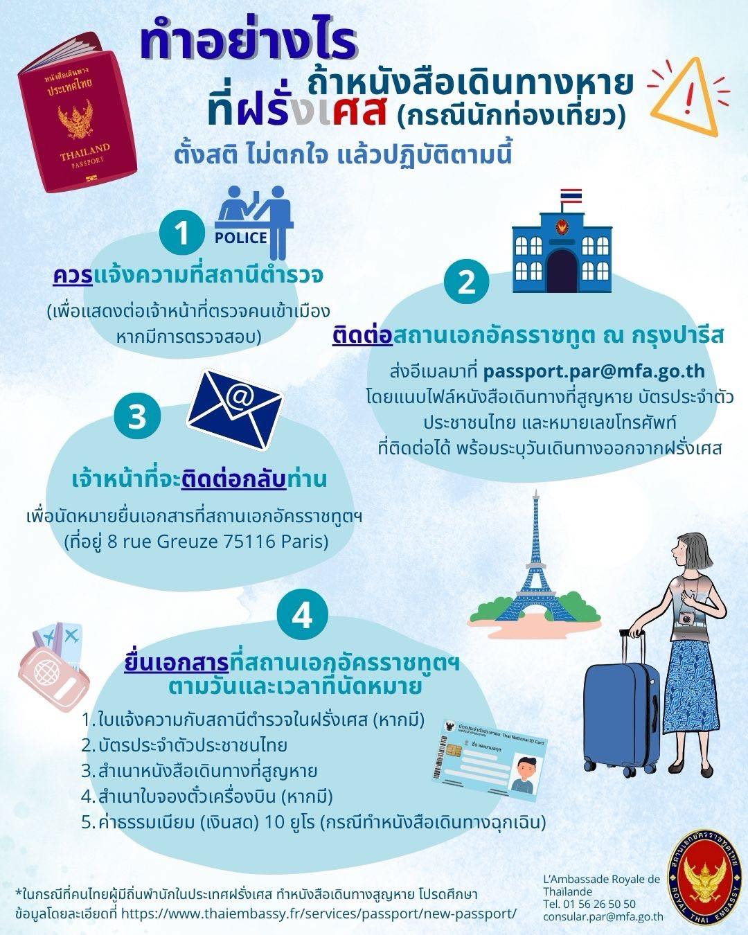 อนึ่ง หากท่านทำหนังสือเดินทางสูญหายแต่ยังไม่มีกำหนดเดินทางออกนอกฝรั่งเศสภายในระยะเวลา 1 เดือน ท่านสามารถขอทำหนังสือเดินทางธรรมดาได้ โดยโปรดเตรียมเอกสารและนัดหมายตามข้อมูลที่ระบุในหน้า http://www.thaiembassy.fr/services/passport/