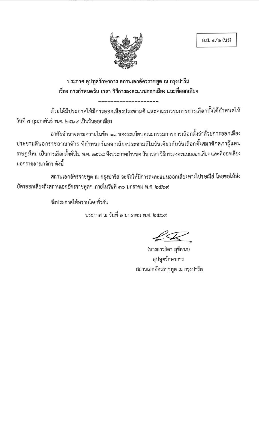 1) สถานเอกอัครราชทูตฯ จะจัดการเลือกตั้งและการออกเสียงประชามติโดยการลงคะแนนทางไปรษณีย์ (เพียงวิธีเดียว) โดยมีกำหนดส่งบัตรเลือกตั้งและบัตรออกเสียงไปยังผู้ใช้สิทธิช่วงก่อนสัปดาห์สุดท้ายของเดือนมกราคม 2569 และวันสุดท้ายที่จะรับบัตรคืนจากผู้ใช้สิทธิคือวันที่ 30 มกราคม 2569 ดังนั้น เมื่อได้รับบัตรแล้ว ขอให้ลงคะแนนและส่งบัตรกลับคืนมายังสถานเอกอัครราชทูตฯ โดยทันที