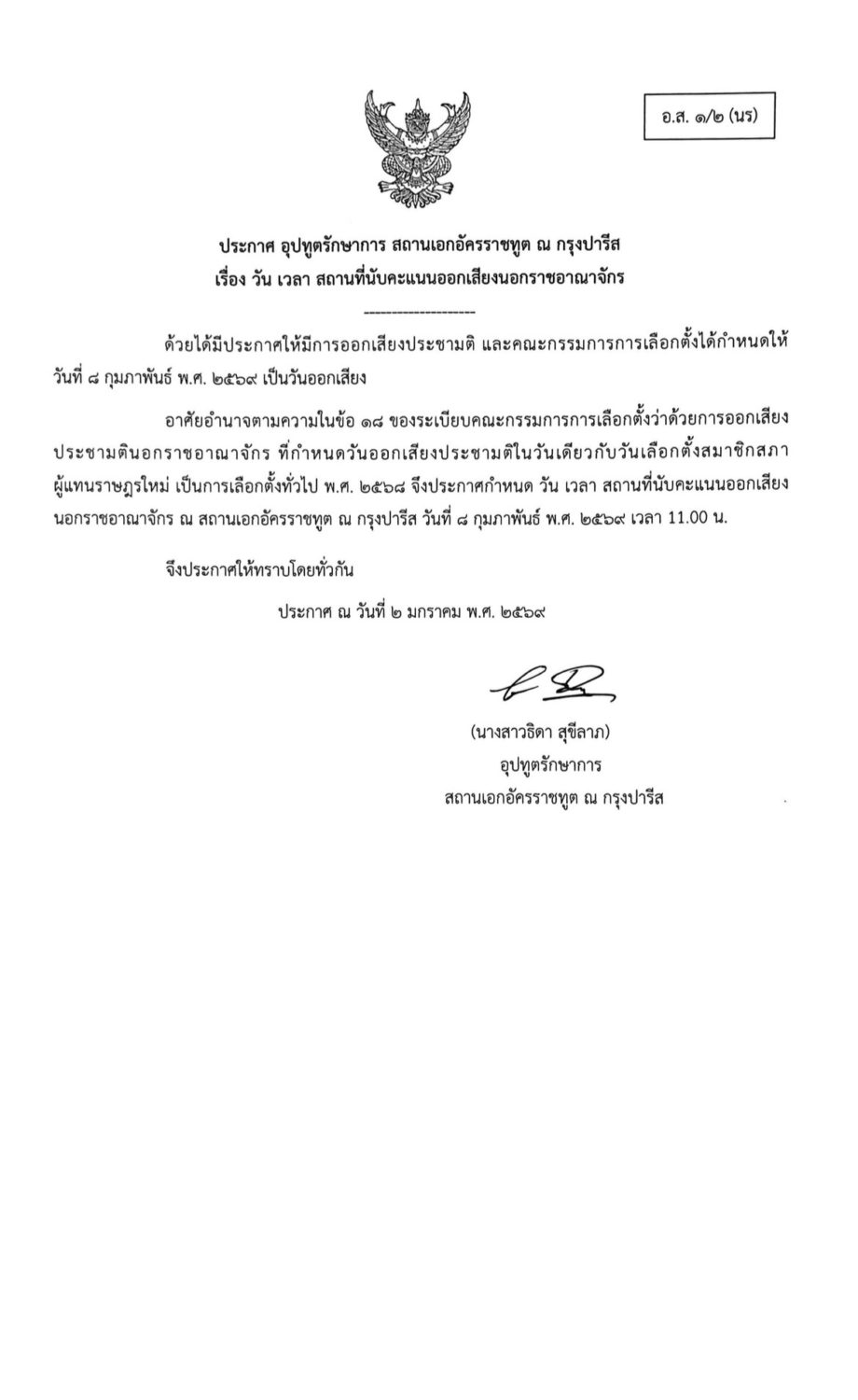 สถานเอกอัครราชทูต ณ กรุงปารีส ขอเรียนคนไทยที่พำนักอาศัยในฝรั่งเศส โมนาโก และแอลจีเรีย ดังนี้